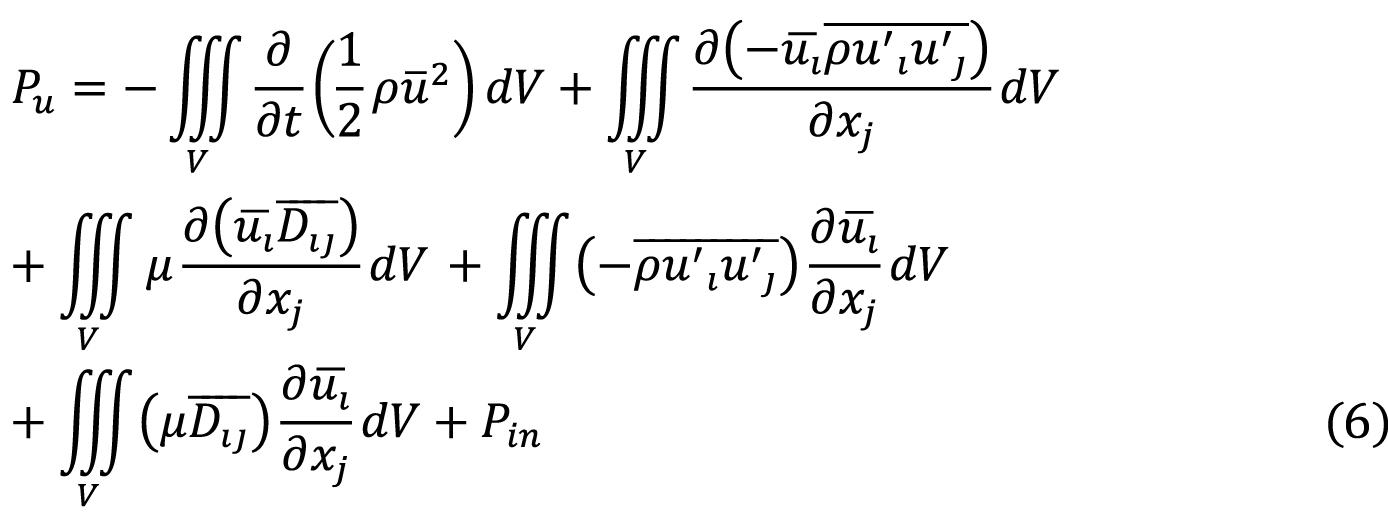 Para entender la relación entre los patrones de flujo turbulento y la pérdida en la bomba centrifuga, se realiza un análisis de la perdida en el fluido a través de la ecuación de energía. Para un flujo turbulento incompresible sin transferencia de calor o variación de temperatura, la ecuación de energía en la bomba puede simplificarse (4);