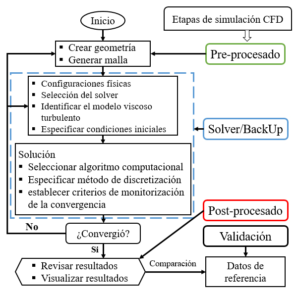 La técnica de simulación CFD se utiliza para diversos fines investigativos, entre ellos, determinar la eficiencia de una máquina o sistema durante su diseño, o también puede utilizarse para analizar dificultades con una máquina o sistema existente y conducir a un diseño mejorado con niveles de eficiencia más altos. En este estudio se aplica la técnica de rediseño realizando los pasos ilustrados en el diagrama de flujo de la Fig. 1, donde se plasma la metodología para la simulación CFD, iniciando con la creación de la geometría, mallado, definición física o de condiciones de frontera, solución y post-procesamiento de los resultados para la validación del modelo CAD.