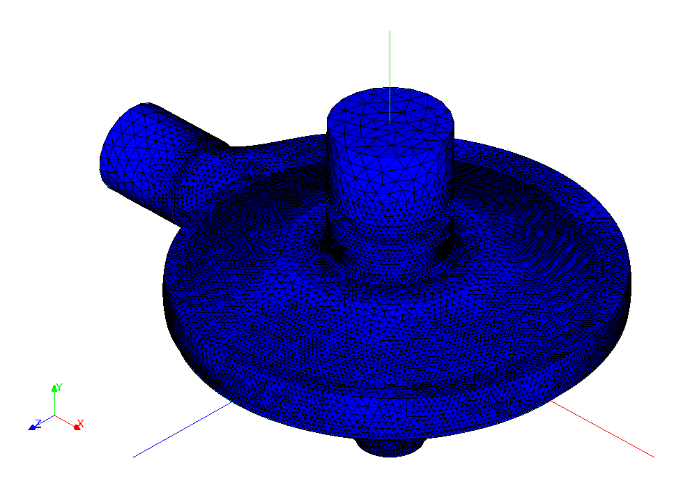 Dicho esto, debido a la complejidad de la geometría y zonas intrincadas se utilizó un mallado tetraédrico con el uso de la herramienta de mallado SALOME el cual utiliza BlockMESH, que permite capturar eficientemente la geometría. Sin embargo, su calidad no es lo suficientemente alta por lo que se toman acciones adicionales. Por consiguiente, para elevar la calidad del mallado tetraédrico y asegurar que se obtiene la mejor malla para la solución, se tomó uno mallado por defecto con un grado de refinamiento de 100 para luego configurar en el BlockMESH el tamaño de los elementos y así vigilar el número de elementos totales en la malla. Después se aplicó un Mesh-Layer en las zonas cercanas a las paredes, especificando el número de capaz a insertar, espesor de capas y tasa de expansión. Finalmente, se puede observar la Fig. 3, la cual presenta el mallado de la bomba de estudio.