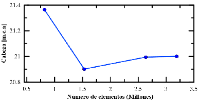 De la Fig. 4 se observa que los valores de cabeza se estabilizan a medida que se aumenta el número de elementos de la malla hasta un valor de 2635017 elementos, a partir de este valor no se presenta variación significativa sobre la cabeza de la bomba, por tanto, se trabajan todas las simulaciones con el número de nodos anteriormente mencionado.