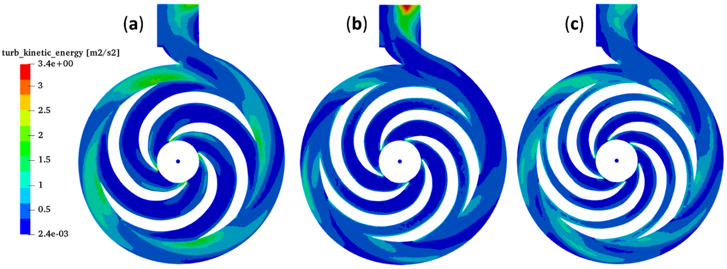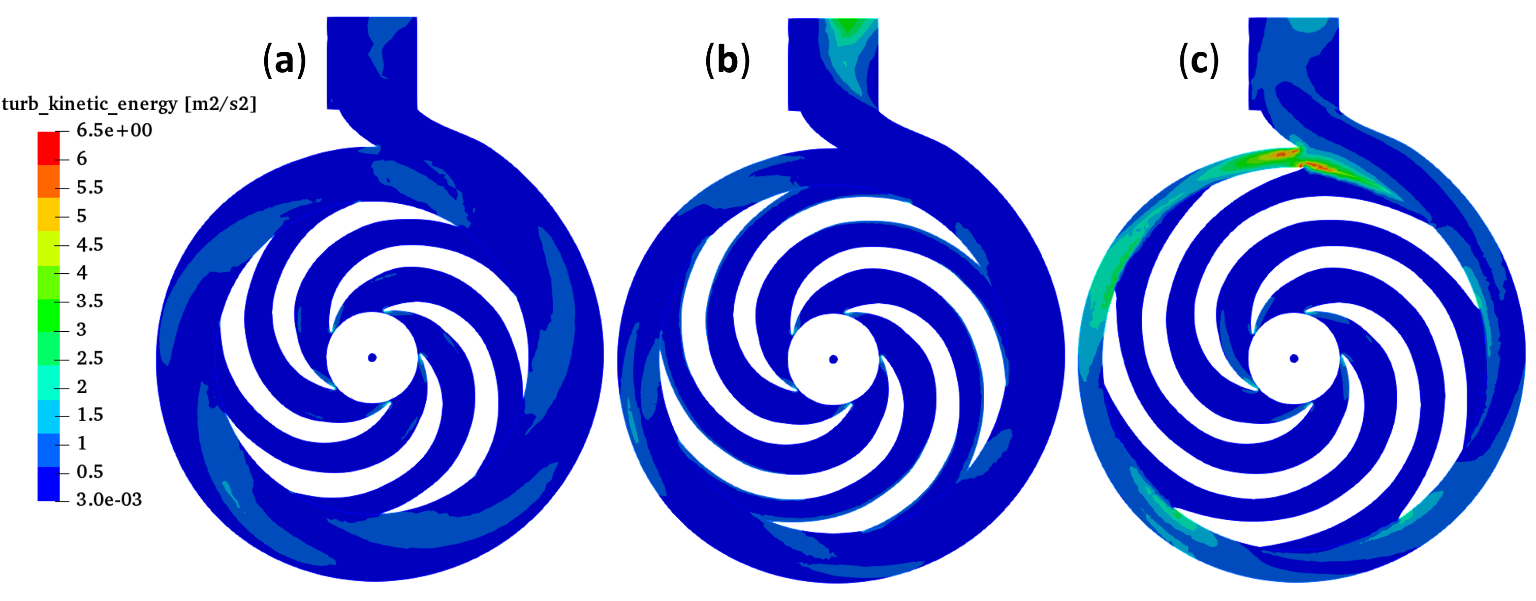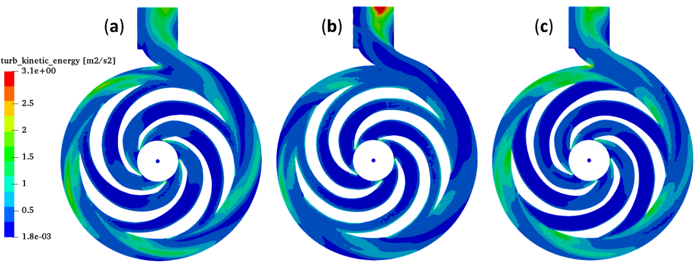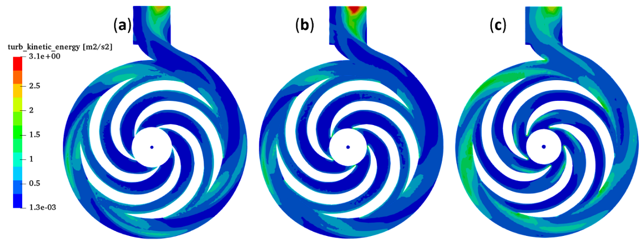 Diagramas de distribución de energía cinética de la turbulencia para las modificaciones de menor espesor y mayor espesor se muestran en la Fig. 13a y Fig. 13c, respectivamente. Los valores más altos de turbulencia se observan principalmente en la interface entre el impeler y la voluta, esto debido al fuerte gradiente de velocidad, ya que las regiones con flujo a alta velocidad entran en contacto con regiones separadas de flujo a baja velocidad [23]. El impulsor de 8.37mm (Fig. 13a), muestra contornos con altos valores de TKE para 75 L/min, ubicados a la salida del impulsor y esto es debido a la alta velocidad del fluido a la salida del impulsor y la baja velocidad en la voluta por lo dicho anteriormente.