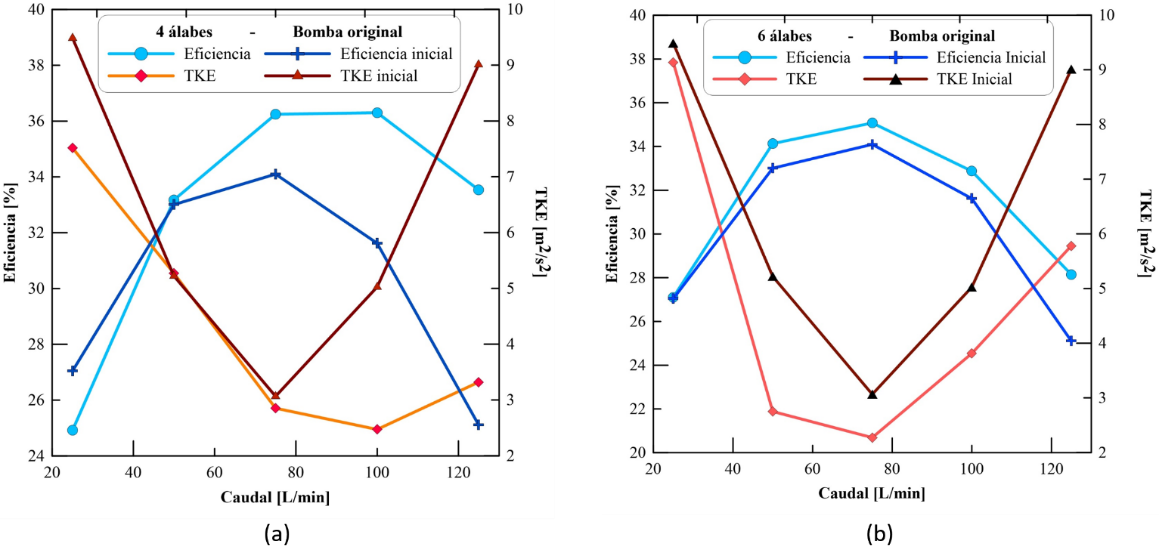 Al reducir el número de álabes a 4 (Fig. 10a) y aumentar el área de flujo del fluido, los niveles de turbulencia, reflejados en los valores de TKE se reducen drásticamente para valores de caudal por encima de 50 L/min, aumentando sustancialmente las presiones en la bomba y mejorando la eficiencia energética en 2.15%. Por otro lado, aumentar el número de álabes a 6 (Fig. 10b) permite un flujo más estable y uniforme al interior del rodete, genera una menor recirculación de fluido y una menor variación de presión, esto producido por la cercanía entre las caras de los álabes, aumentando en menor medida la eficiencia de la bomba en 0.98%.