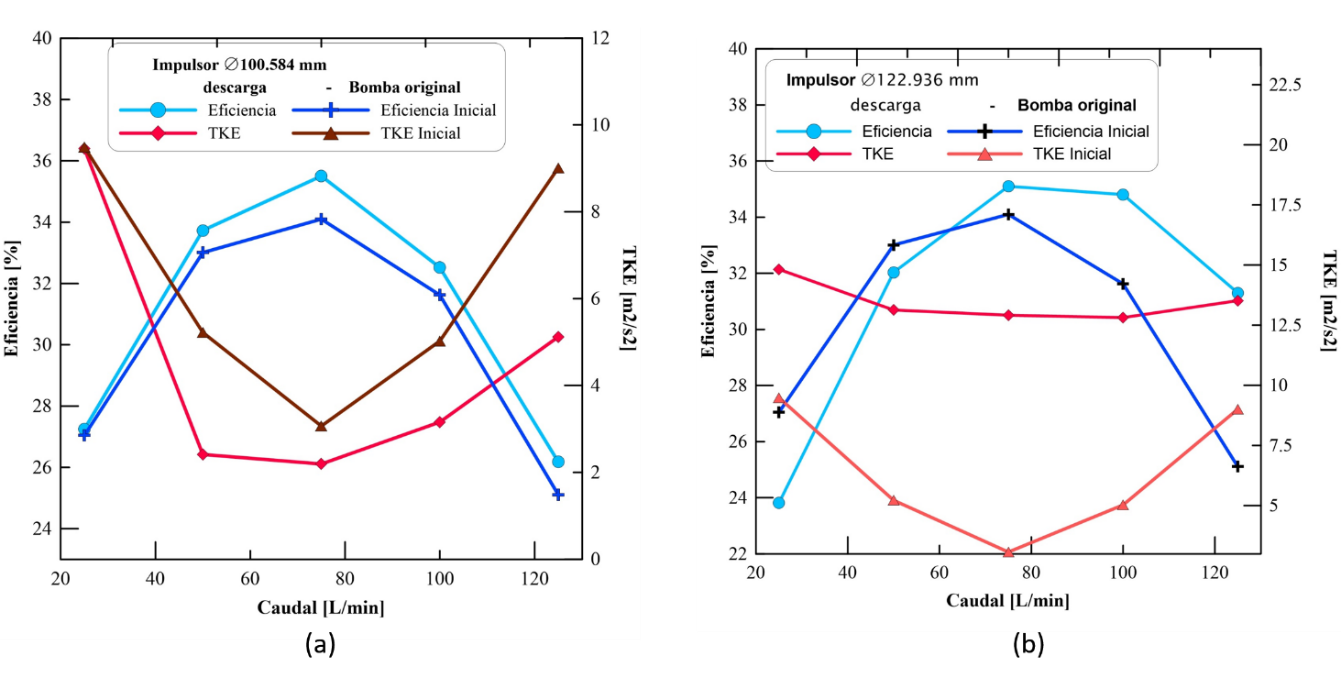 El aumento en la eficiencia observado en la Fig. 14b corresponde a un 4.71% sobre la bomba original y un 4.24 m2/s2 menor que la bomba original. También se aprecia una disminución sustancial en la energía cinética que absorbe la turbulencia para todos los puntos de caudal, siendo más notoria en los caudales de 75, 100 y 125 L/min, por consiguiente, la eficiencia aumenta en estos mismos puntos, esta mejora se debe a la reducción de las pérdidas derivadas de la generación de remolinos en el paso y la salida del impulsor [50].