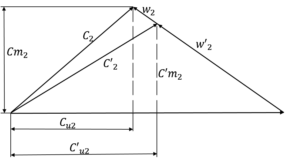 Para el impulsor con espesor mayor (Fig. 13c) se obtienen los valores de 36.32% para la eficiencia y 2.18 m2/s2 (Fig. 15b) para la turbulencia siendo estos valores las cantidades más bajas en todo el estudio paramétrico y modelo de pérdida, debido a que el espesor de salida del impeler es uno de los principales parámetros en el impulsor, lo cual tiene un efecto significativo en el rendimiento, en la ubicación de las zonas de baja presión en la entrada del álabe y en el flujo de corto circuito en el impulsor. Este cambio causa que la componente Cm2 del triángulo de velocidades a la salida del impulsor (Fig. 14) cambie correspondientemente. Cuando b2 se incrementa y llega a b'2, Cm2 se reducirá a C'm2 lo cual implica que la energía cinética en la salida del impeler se reduce, lo que conducirá a la reducción de las perdidas hidráulicas [25], [49].
