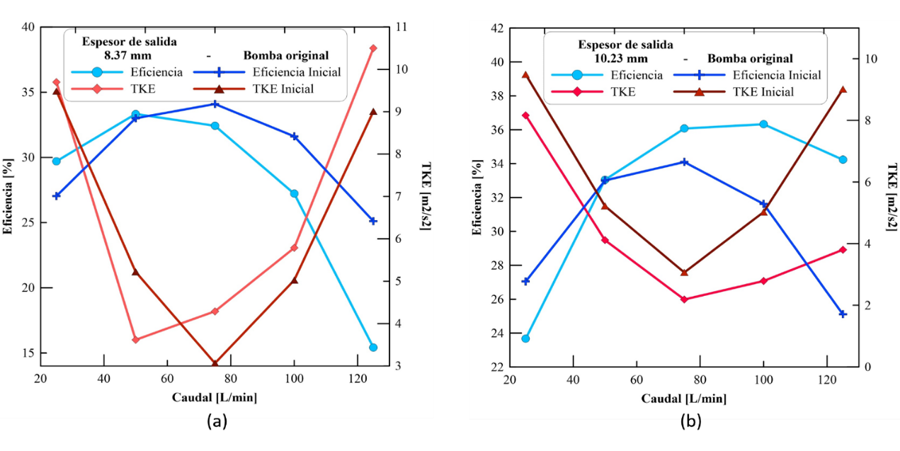 Contrario a esto, el parámetro que tuvo mayor influencia en la eficiencia y la turbulencia fue el aumento del espesor de salida, con el cual se lograron aumentos en la eficiencia de 4.71% y reducción de la TKE en 4.24 m2/s2 respecto a la bomba original, puesto que dicha configuración reduce las pérdidas debida a la fricción del fluido con las paredes de la voluta. También se aprecia en esta configuración, una disminución sustancial en la energía cinética que absorbe la turbulencia para todos los puntos de caudal, siendo más notoria en los caudales de 75, 100 y 125 L/min, por consiguiente, la eficiencia aumenta en estos mismos puntos, esta mejora se debe a la reducción de las pérdidas derivadas de la generación de remolinos en el paso y la salida del impulsor.