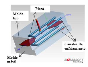 Introducción— Una de las principales preocupaciones en la industria de moldeo por inyección es garantizar un procesamiento eficiente de materiales y la adquisición de productos a costos razonables que reflejen sólidas economías de escalas para grandes series de producción. El tiempo de enfriamiento es una variable influyente y decisiva para la eficiencia de estas series, en ciertas condiciones de temperatura, aumenta junto con el espesor de la pieza. Por lo tanto, para cierto espesor, una baja temperatura del molde y una alta temperatura de extracción de la pieza tienen una influencia considerable en la reducción del tiempo de enfriamiento, lo que constituye un gran lapso del tiempo del ciclo de proceso: entre 80% y 85%. En este trabajo, el proceso de moldeo por inyección se simula para explorar la distribución de la temperatura y el proceso de llenado del material de un molde diseñado para hacer “etiquetas de oreja-chapetas”, que se utilizan para el control visual del ganado.