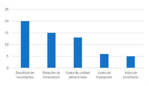 Conclusions— the variable in logistics cost savings, discriminated by area, is concentrated in the storage area. The group of main indicators of the storage area with which control and monitoring can be performed are inventory accuracy, inventory turnover and cost of stored unit.