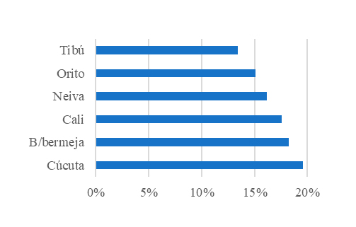 Por otra parte, se realizó el análisis de conglomerados por área y ciudad, identificando las agrupaciones de indicadores más utilizados por área, encontrando que los indicadores de almacenamiento como la exactitud en inventario, rotación de inventario y costo por unidad almacenada son los más relacionados con los ahorros en costos logísticos. En este sentido el estudio es importante porque demuestra que el empresario puede iniciar el seguimiento y control a partir de estos tres indicadores que en la práctica son los más utilizados para ahorrar costos en la empresa. Por otra parte la ciudad donde mayores ahorros se identificaron fue en Orito, 0.89% en promedio de todos los ahorros a nivel nacional.