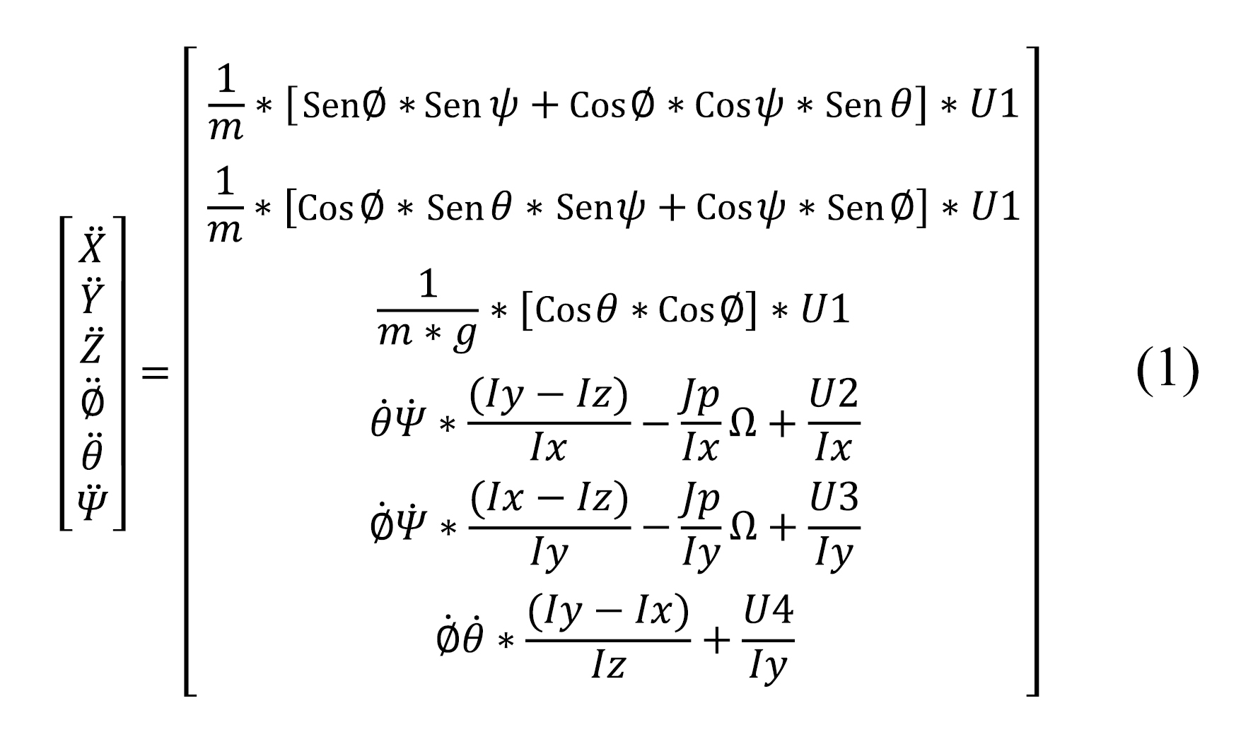 El modelo matemático del quadrotor ha sido demostrado en múltiples artículos. El modelo dinámico utilizado está basado en ecuaciones de Euler-Lagrange y ecuaciones de Newton Euler para llegar a un modelo de representación de variables de estado [9], [10], [11]. Ciertas restricciones como las velocidades de giro respecto al marco de la tierra y las velocidades angulares respecto al marco del cuerpo son aproximadamente iguales para ángulos que estén entre –π/6 y π/6, las cuales permiten realizar una aproximación lineal del modelo matemático. En la ecuación (1) se presenta el modelo en representación de variables de estado.