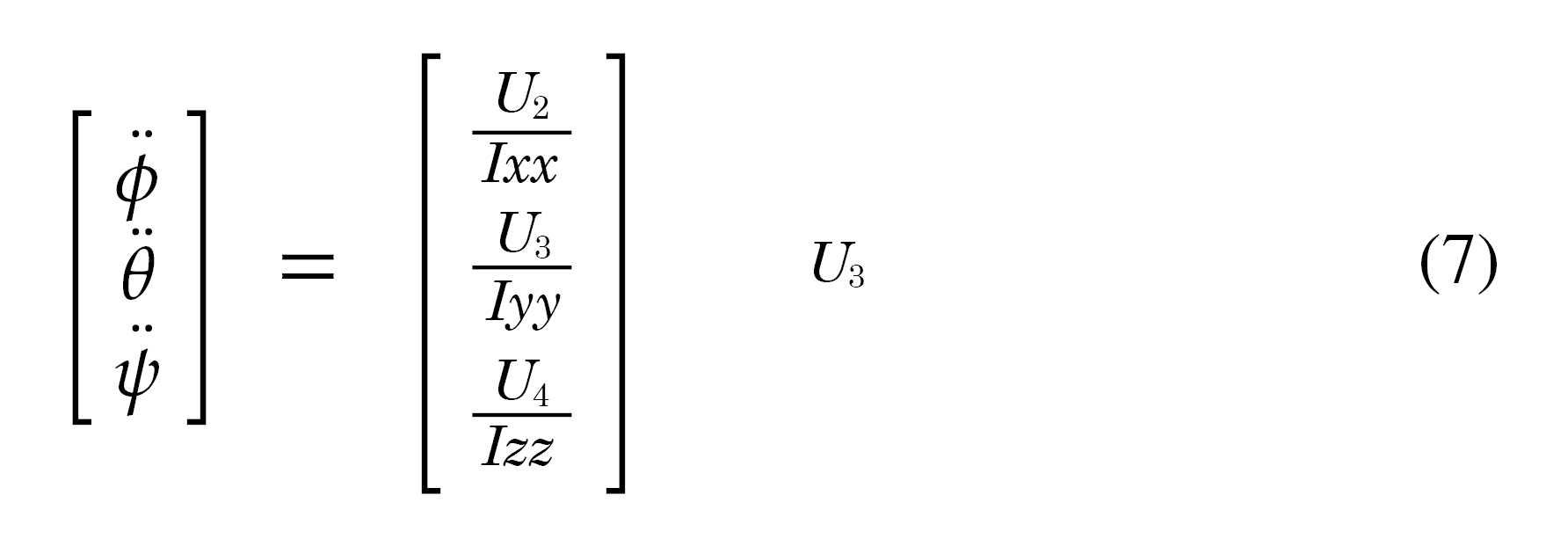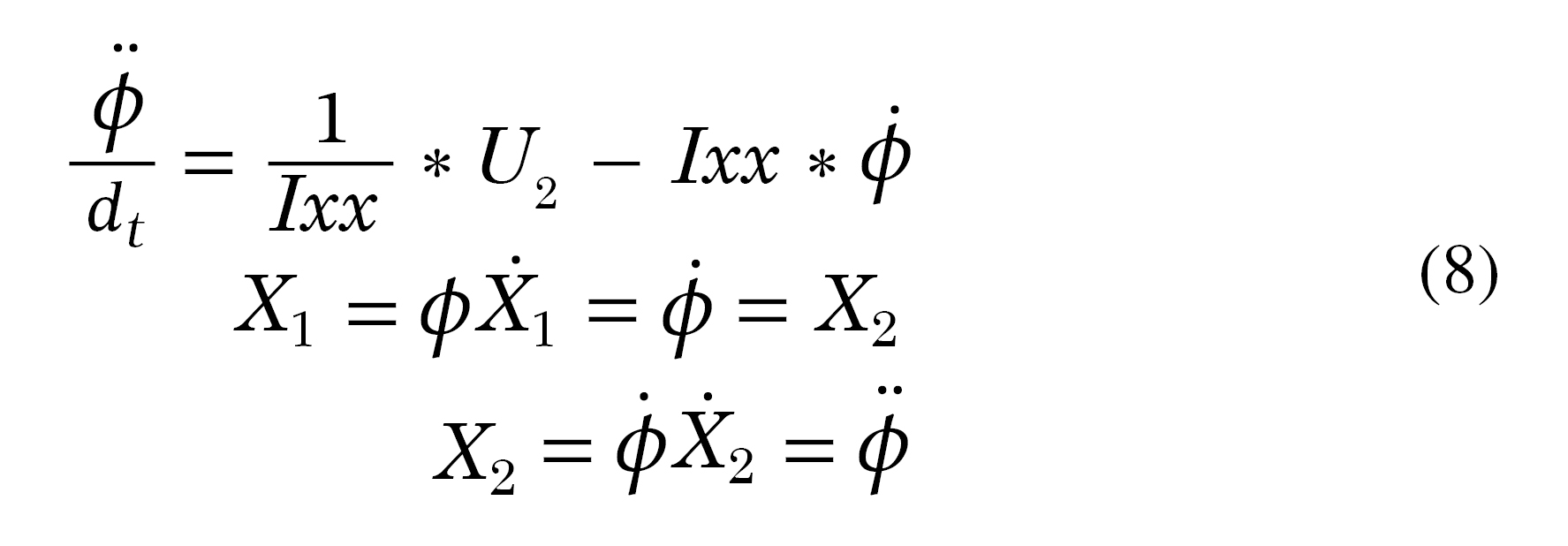 Debido a la simetría del quadrotor y la uniformidad en su estructura se asumen las mismas ganancias para los ángulos Pitch y Roll. Las variables de estado para estos ángulos están definidas por (8):