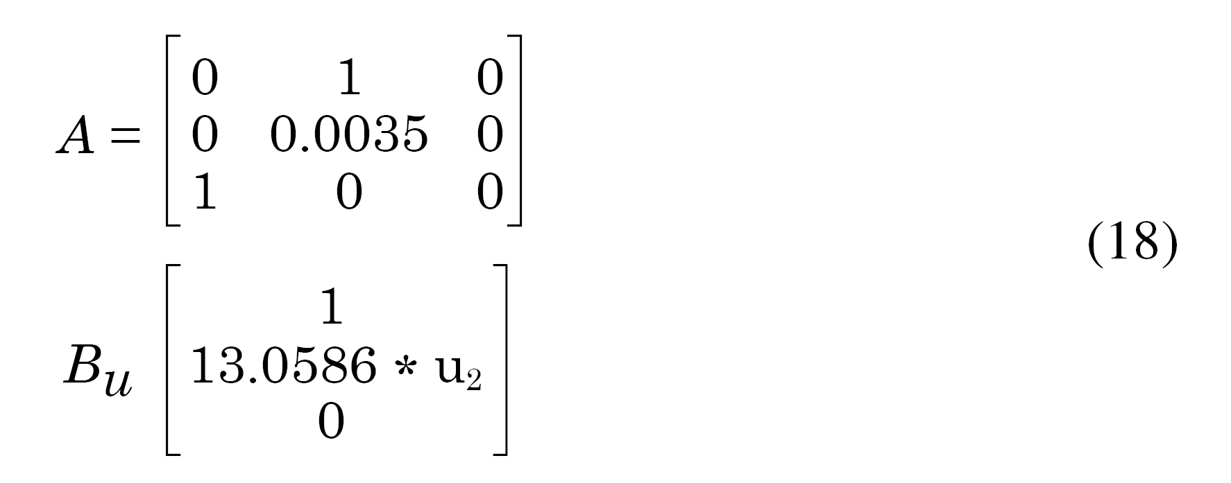 En la ecuación (14), F es el vector de ganancias de realimentación que ponderan cada una de las variables de estado. Calculando las ganancias de realimentación mediante la función Acker en Matlab y a partir del diseño de polos deseados se obtiene (15):