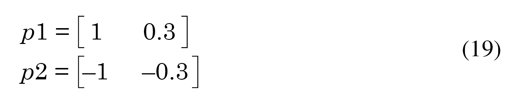 Donde pi estará variando entre cuatro valores que forman un sistema politópico para cada uno de los ejes de rotación y, p1 y p2 representan la variación en el ciclo de trabajo en los motores del quadrotor y están definidos entre los valores de (19):