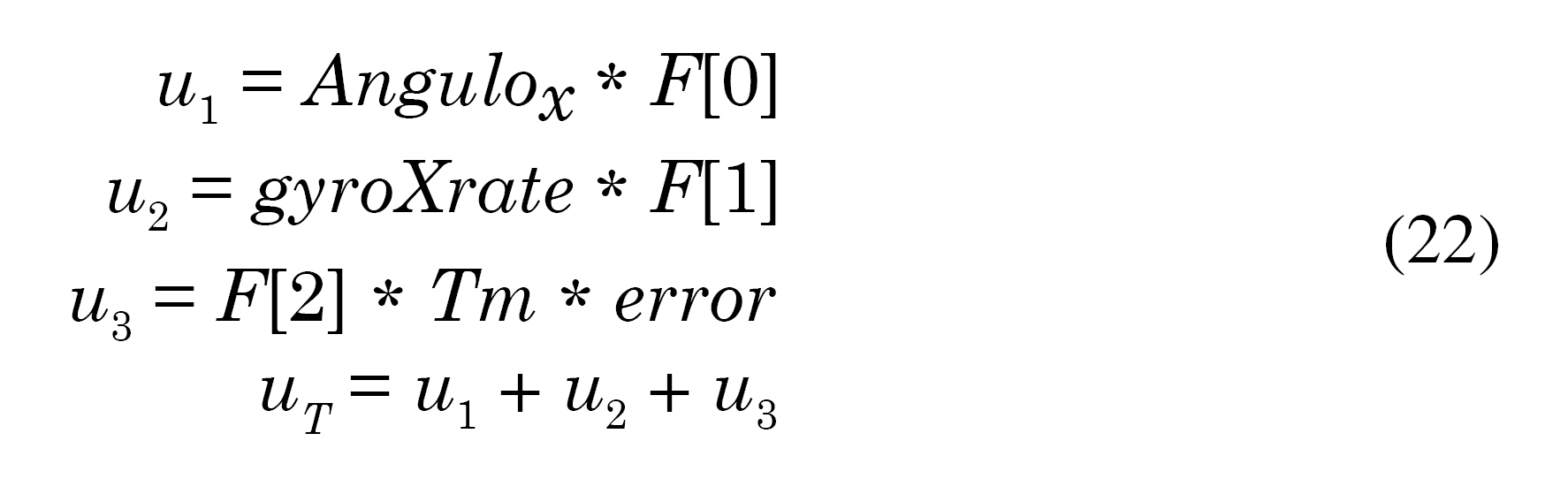 Se diseña el controlador a partir de la multiplicación de las variables de estado por las ganancias calculadas y se halla una ganancia de realimentación total que realimentará el sistema por cada eje. Por ejemplo, las ecuaciones que describen el controlador implementadas en el microcontrolador para el caso del eje Roll son (22):