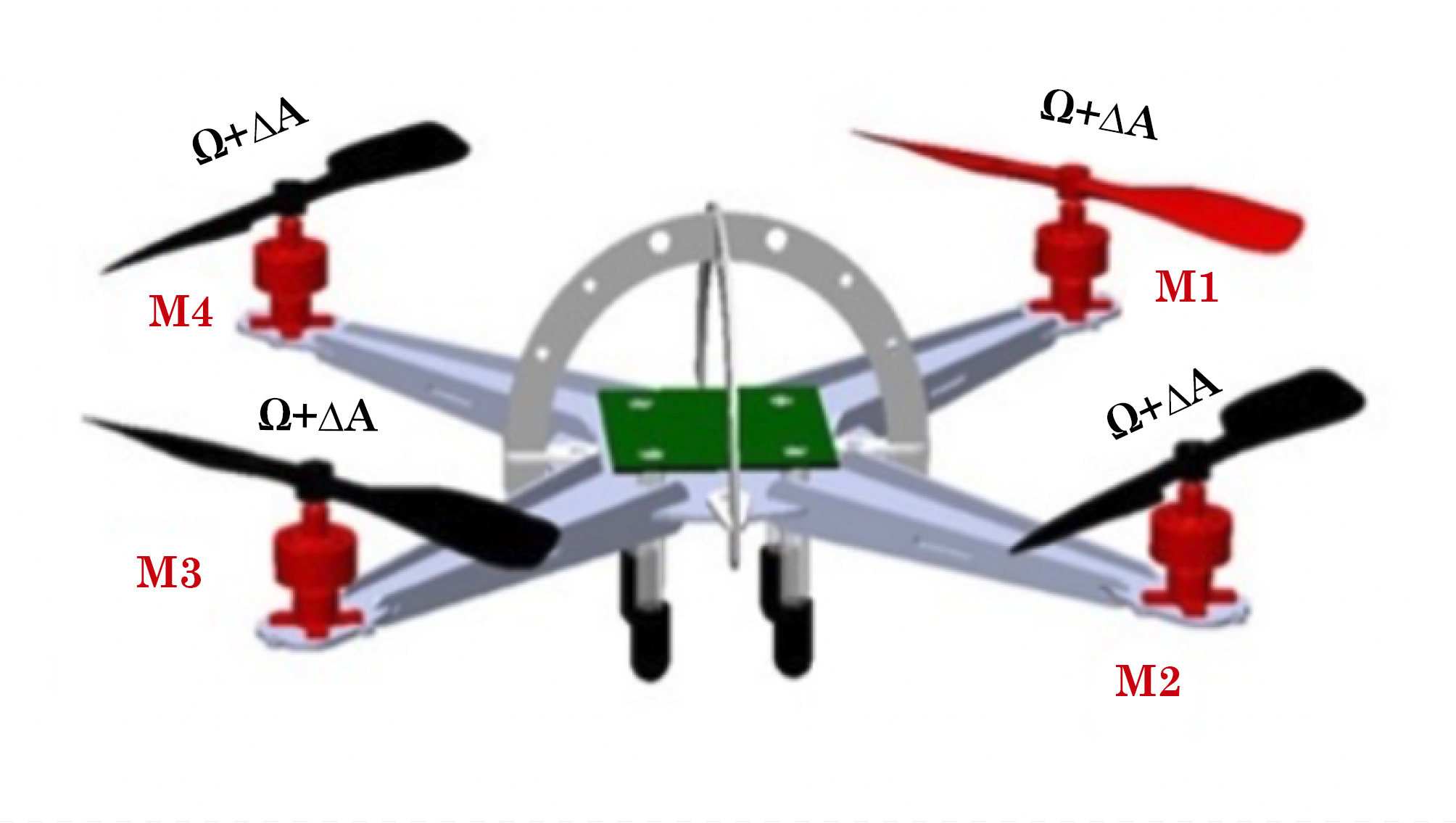 Los movimientos en el aire del quadrotor se basan en la variación de la aceleración de sus motores; si se quiere lograr un desplazamiento del quadrotor en el aire es necesario reducir en pequeñas proporciones la velocidad ΔA en sus motores Fig. 3. Si se quiere obtener un desplazamiento hacia delante del quadrotor se reduce la velocidad ΔA del motor M1 en pequeñas proporciones logrando que se genere un ángulo en este eje.