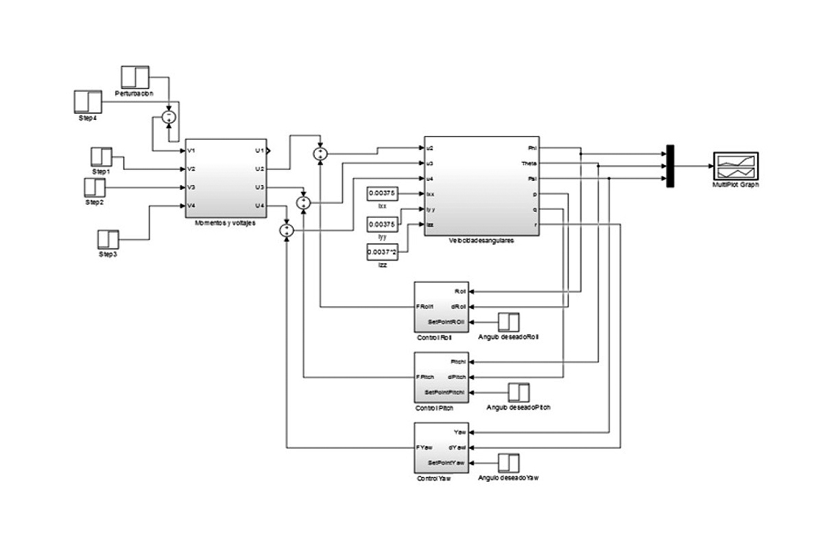 Para realizar la validación del modelo se utilizó un banco de pruebas Fig. 4, en el cual se validó el modelo matemático presentado mediante simulación utilizando el software Matlab y su toolbox Simulink. Se validó la respuesta de los tres ejes observando la respuesta de los tres ángulos Roll (ϕ) Pitch (θ) y Yaw (ψ) en lazo abierto. Para realizar la captura de los datos a la tarjeta de desarrollo, se agrego un módulo bluetooth para la transmisión de los datos utilizando el protocolo serial. Los datos fueron recibidos en una computadora y guardados en un archivo con extensión “.csv”; en el caso de la simulación, los datos fueron exportados al workspace de Matlab y desde allí exportados a un archivo con la extensión “.xls”.