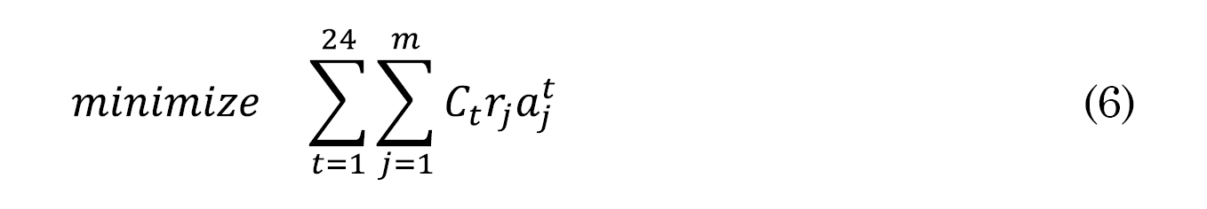 El objetivo es encontrar el vector a = [a11, a12, …, a124, a21, a22, …., a224, aj1…. aj24] [18] de tal manera que el costo diario de la electricidad sea minimizado, donde Ct es el costo del monomio durante el t-ésimo periodo de acuerdo al modelo presentado en la sección III.