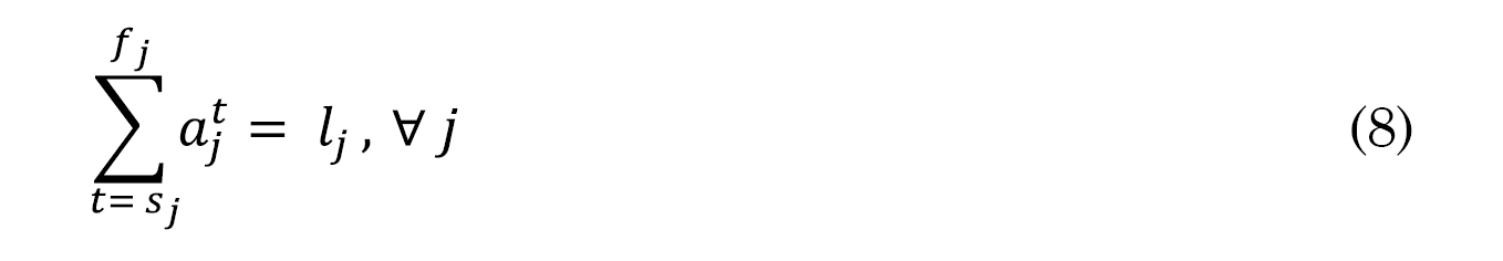 La restricción temporal de cada dispositivo, representada con su duración establecida de encendido (lj), se relaciona con la variable binaria a, durante todos los periodos analizados, dada por (8).
