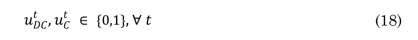 Debido a que durante el periodo existe una restricción de carga de la batería, es necesario introducir las variables binarias uCt y uDtC que evitan la carga y descarga de la batería al mismo tiempo, que se encuentra planteada en la restricción (13).