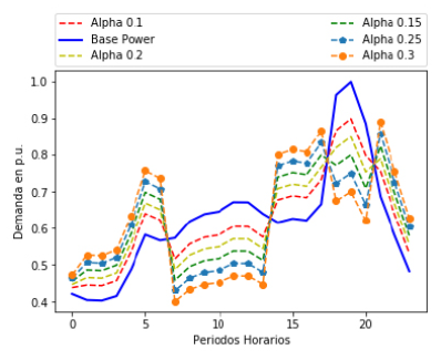 Uno de los principales retos del mercado colombiano es la inclusión de programas de respuesta a la demanda [26], [46]. Con el fin de comprender esta reacción a los cambios de precios, es decir, el grado de participación en los programas y con el acceso previo de la información del costo del monomio, se incorpora el concepto de elasticidad sujeto a un factor Alpha (α) [14]-[16], el cual es incluido únicamente para este caso como una restricción del sistema que permite analizar las modificaciones en el perfil de carga final.