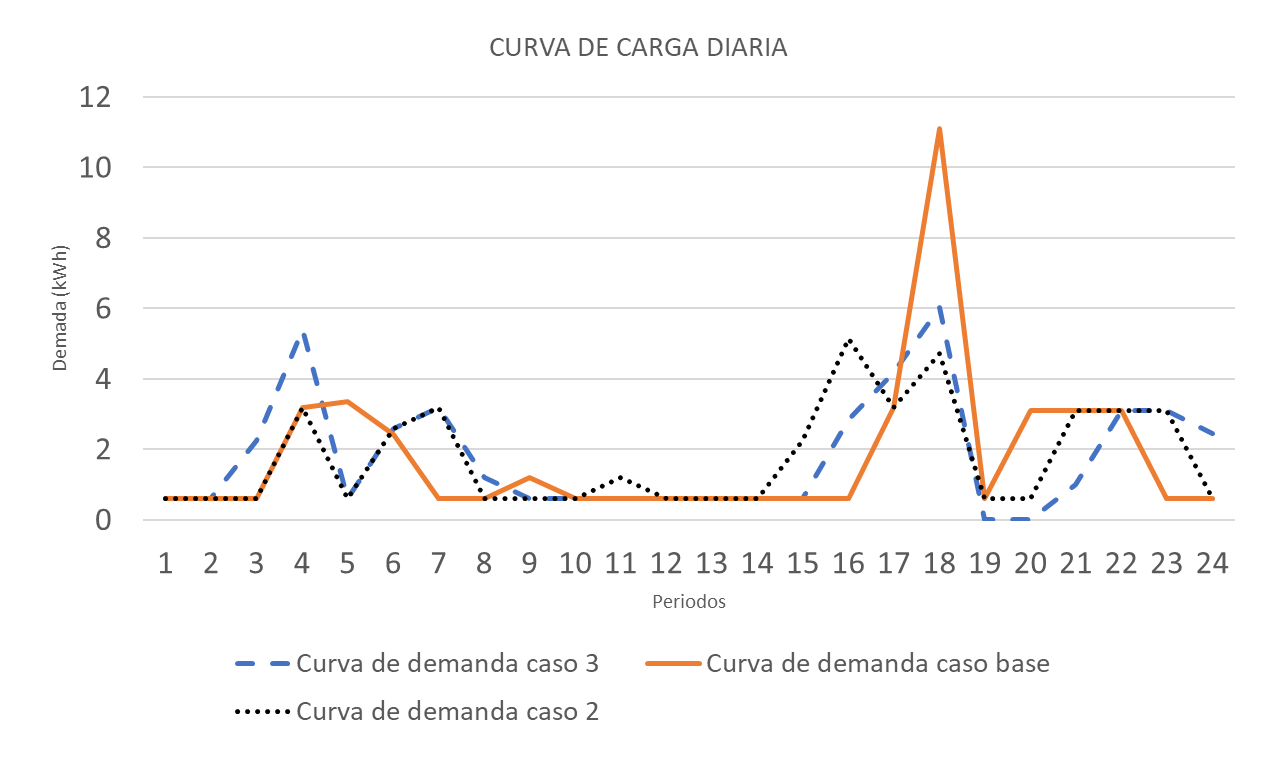 Con la estructura de catorce cargas flexibles seleccionadas y programadas propuesto por [53], en el modelo propuesto del segundo caso se alcanzan beneficios para el usuario. Aunque este no reduce el consumo energético diario, provee un comportamiento óptimo durante las horas pico (7 pm a 9 pm) en el sector residencial, con disposición de traslado de electrodomésticos a horas de menor costo (6 am a 8 am). Dentro del análisis de resultados en el segundo caso, se alcanza un ahorro del 12.1% sobre el diario total en comparación del caso base.