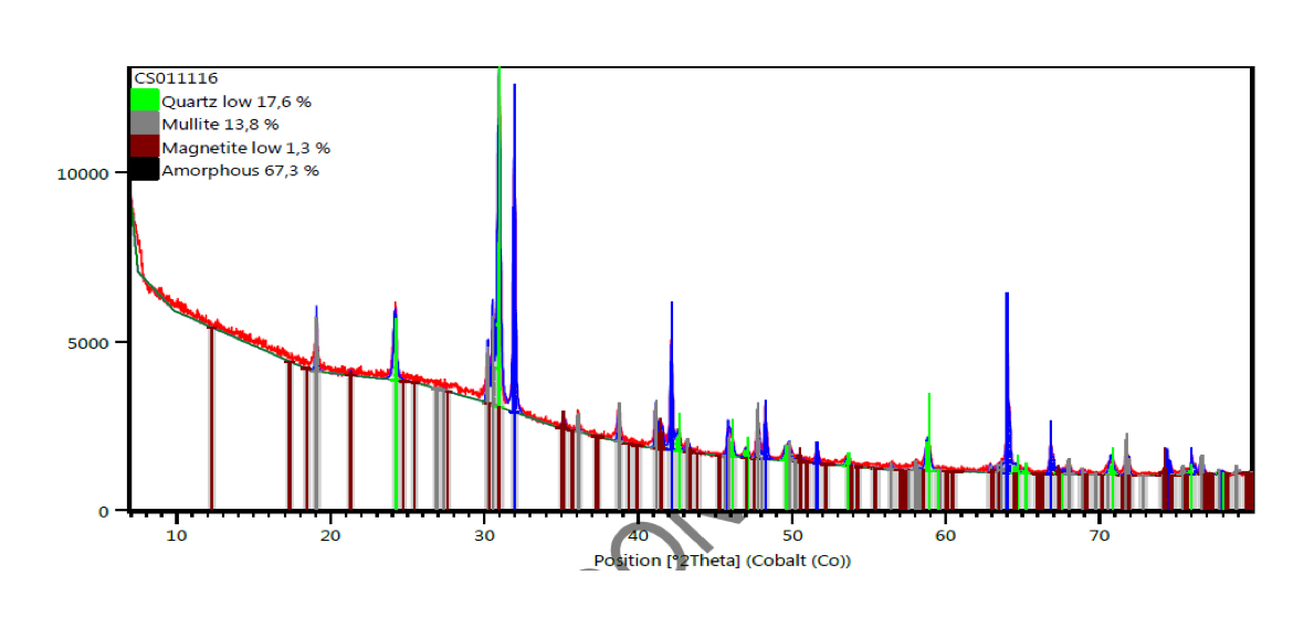 The results were analyzed in Hi-Score Pluss software [19], following Rietveld semi-quantitative method with ICSD database. XRD results showed 67.3% amorphous material by weight, quartz 17.6%, and 1.3% magnetite (Fig. 1).