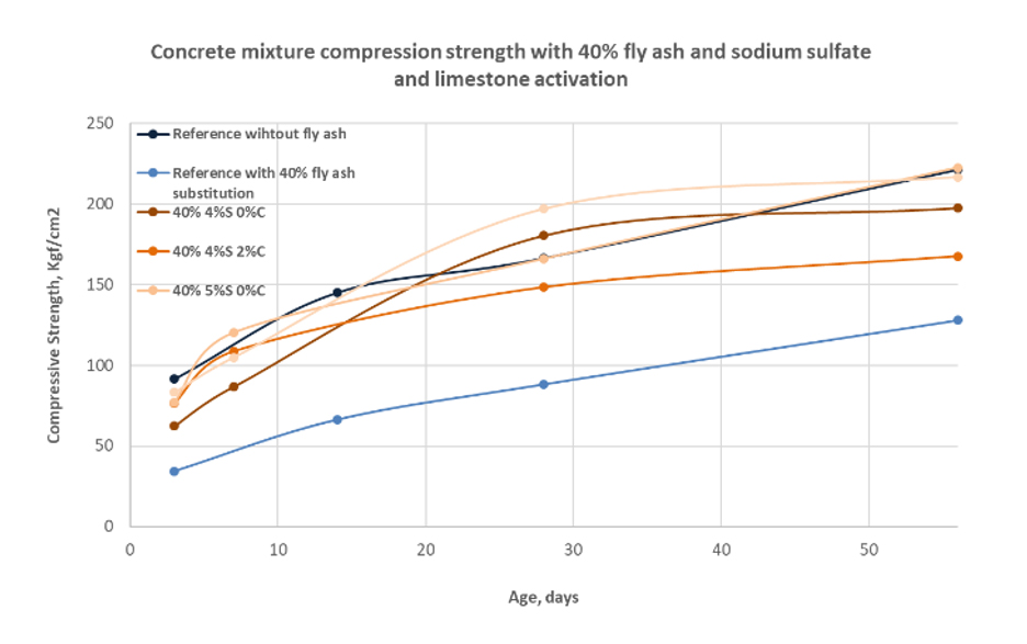 4 × 8 inch cylindrical concrete specimens were prepared in order to evaluate compression strength of concrete mixtures with replacement of 40% by fly ash, using activation with NaOH and sodium sulfate and limestone mix. A mixture to obtain a concrete with resistance to compression at 28 days of 210 kgf/cm2 was designed. Results were compared with two reference patterns. One using 100% cement without either admixture activation or additives (RS1, and another one with a mixture of 60% cement and 40% fly ash, “cementous material”, without either activation or admixture (RS2). The first mixtures were prepared using NaOH as activator, with dosage per gram of binder of 0.025, 0.05, 0.07 and 0.09, maintaining the other mixture elements constant. Then compression strength at 3, 14, 28, and 56 days was evaluated.