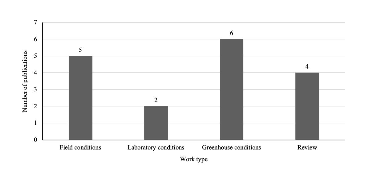 Fig. 2 shows that of the 17 articles consulted, six of them were works carried out at the greenhouse level, five were carried out under field conditions, four correspond to literature reviews from years prior to 2010 and two studies were carried out at laboratory level.