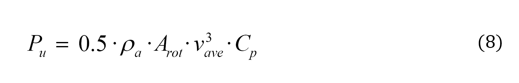 With, Pu: useful power of the windmill (W); ρa: density of the air in the place of the location (kg m-3); Arot: area of wind rotor (m2); vave: average speed of the wind of the locality (m s-1).
