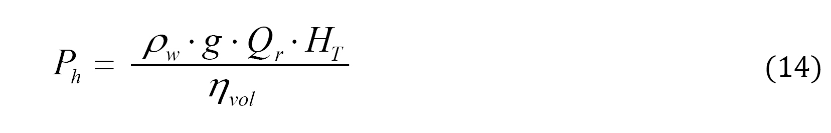 Hydraulic power of the pump was calculated with (14):