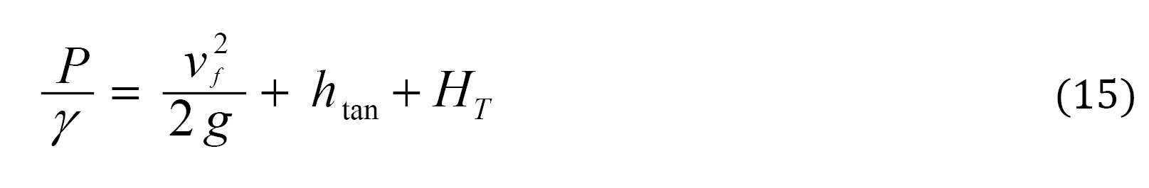 With, P: hydrodynamic pressure in the piston (N m–2); vf: speed of the fluid (m s–1); htan: height of the storage tank (m); HT: total height of pumping (m); γ: specific weight of the water (9800 N m–3); Apipe: area of the pipe (m2).