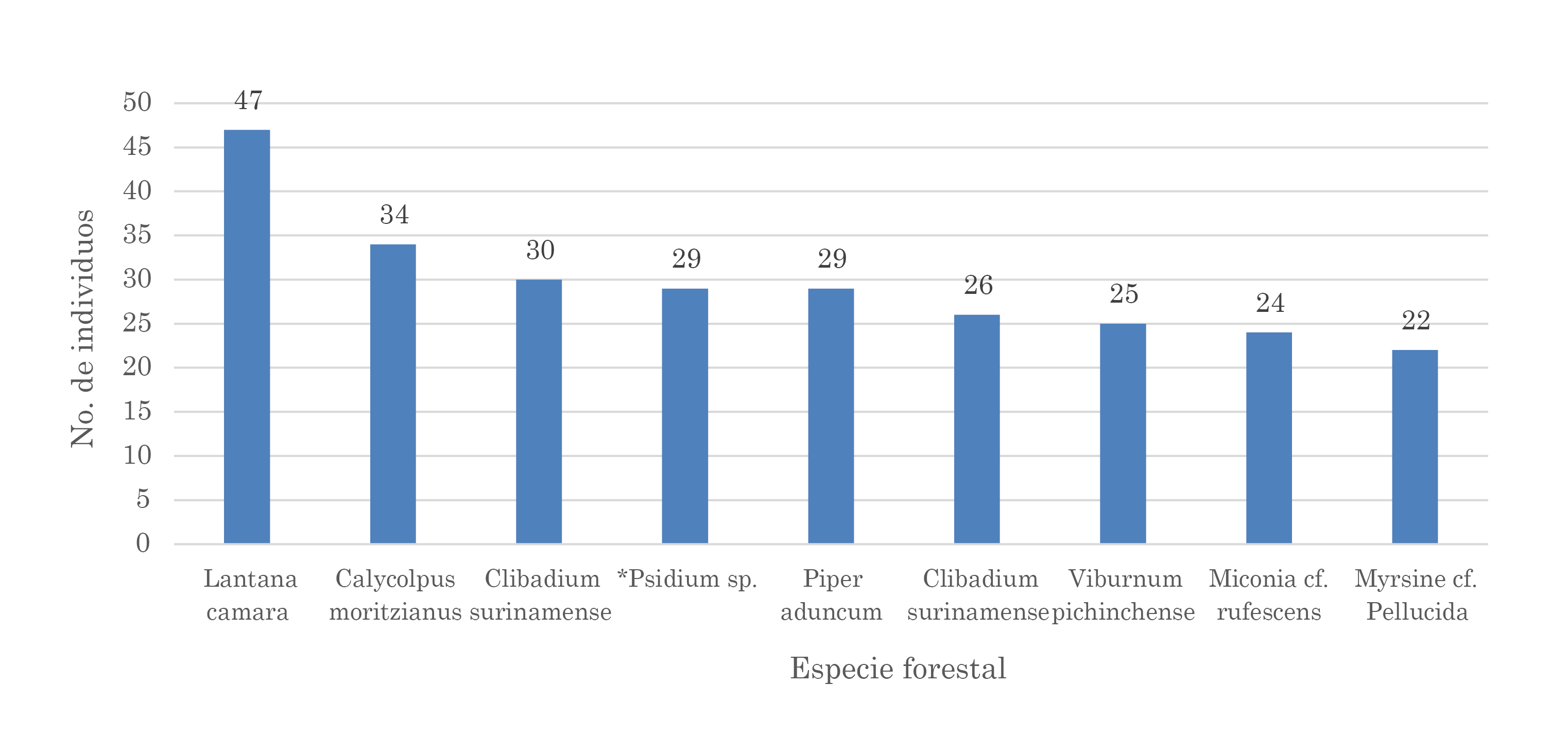 Las especies cultivadas comercialmente, como el naranjo (Citrus sinensis (L.) Osbeck), limón (Citrus limon (L.) Burm. f.), pumarroso (Syzygium jambos (L.) Alston), aguacate (Perse americana Mill), mango (Mangifera indica L.), ciruelo (Eryobothria japónica Lindl) y papayo (Carica papaya L.), son individuos introducidos por los agricultores, debido al aprovechamiento de sus frutos; otras especies introducidas son los arbustos leucaena (Leucaena leucocephala (Lam.) de Wit) y tártago (Ricinus communis L.), que se han constituido en invasoras y que crecen en zonas abiertas; con excepción de estas especies, los demás individuos reportados son nativos, varios de estos registran los mayores número de representantes, ubicando los subarbustos como la especie más abundante y colonizadora de la zona, en los que se incluyen las especies Lantana cámara L., Baccharis trinervis Pers y Clibadium surinamense L., además de los árboles con menos de 10 metros de altitud, las especies correspondientes a individuos sucesionales de estadios intermedios, cuentan con un gran número de individuos, de los cuales se destacan Pseudopiptocarpha cf. garcia, Viburnum tinoides L., Myrsine coriácea R. Br. ex Roem. & Schult.y Piper sp. Únicamente las especies de mayor porte, como Oreopanax cf. pallidum Cuatrec., Erythrina cf. fusca Lour., Ficus cf. americana Aubl., Clusia cf. inesiana Cuatrec y las especies de guamo Inga psittacorum L. Uribe y Inga cf. velutina Willd., pertenecen a bosques secundarios tardíos, con mayor desarrollo estructural por su tamaño, grosor copa y asociaciones con epifitas y lianas.