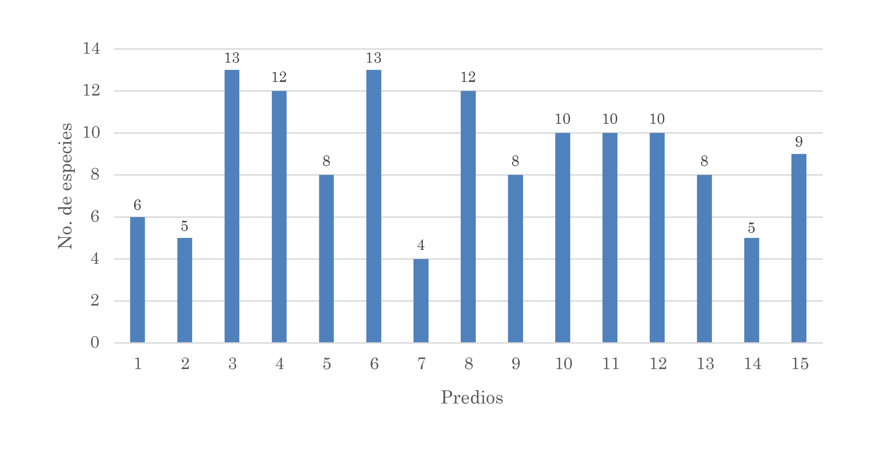 En el diagrama conglomerados para los 15 predios del municipio de La Playa, se puede evidenciar que el predio El Porvenir (2), no tienen similitud con los demás predios del municipio, contando con una abundancia de 22 individuos, riqueza de 15, diversidad de 1.29, equidad de 1.19 y dominancia de 0.22 (Fig. 5).