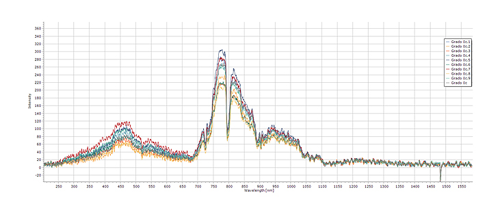 250 spectral readings were obtained as illustrated in Fig. 2, where 10 spectral signatures are observed in the range of 200 nm to 1600 nm of a strawberry leaflet in grade 0 of affectation of Mycosphaerella fragariae according to the scale [20]. The behavior shown in the Fig. 3 is similar in all the readings made, where an increase in the reflectance value is evidenced at wavelengths between 700 nm and 1200 nm, which agrees with the usual behavior of plant surfaces [23].