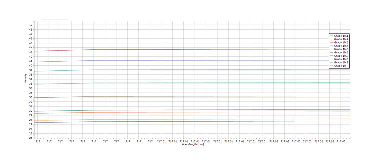 Spectroscopy Ninja software allows a very high level of precision in identifying reflectance values at specific lengths of the electromagnetic spectrum, as illustrated in Fig. 3 where a precise approach to the red edge band (717 nm) is represented and its reflectance value is identified in each of the readings made for the leaflet under evaluation. Each of the lines is a reading made with the spectroradiometer, for the case illustrated, for a leaf with grade 0 of affectation, that is, without lesions caused by Mycosphaerella fragariae. It could be observed that the differences between the readings of the same leaf for a specific wavelength is less than 20 watts, which is small considering the variation in the entire spectrum signature that shows peaks of more than 300 watts between the wavelength of 750 nm and 800 nm.