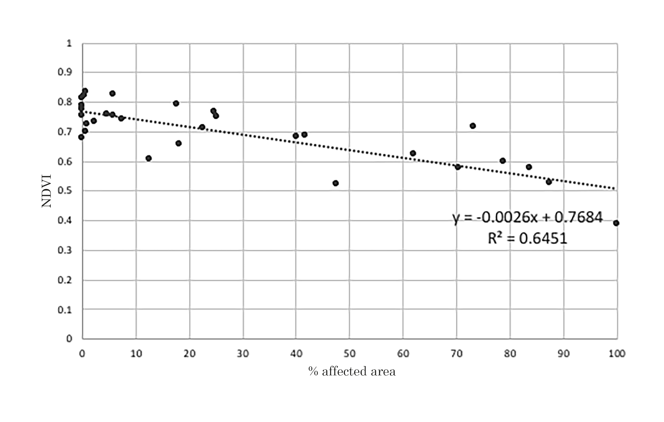 It was found that the NDVI behaves according to the linear equation y = –0.0026x + 0.7684 with a coefficient of variation R2 = 0.6451, a p-Value of 0.000, which being less that 0.05 indicates that there is a linear dependence between the two variables. The RMSE value was 0.0613, which indicates that the error between the observed and predicted data is low for the NDVI values. The assumptions of normality and homogeneity are fulfilled from t student and shapiro-Wilk with p-value of 0.2097 and 0.2543 respectively. This indicates that the NDVI index obtained from the reflectance of different degrees of disease involvement is related to the percentage of affected area with a significance of 64%, like that found by UNIBONN (Germany) [27], where the NDVI index allowed a distinctive differentiation between three sugar beetroot diseases.