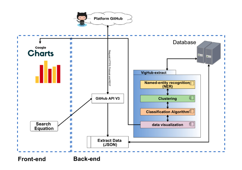 From a topic of interest or research, in which we want to investigate to know the current state of technologies, keywords (search equation) are entered in the VigHub browser, this connects the API-GitHub.
