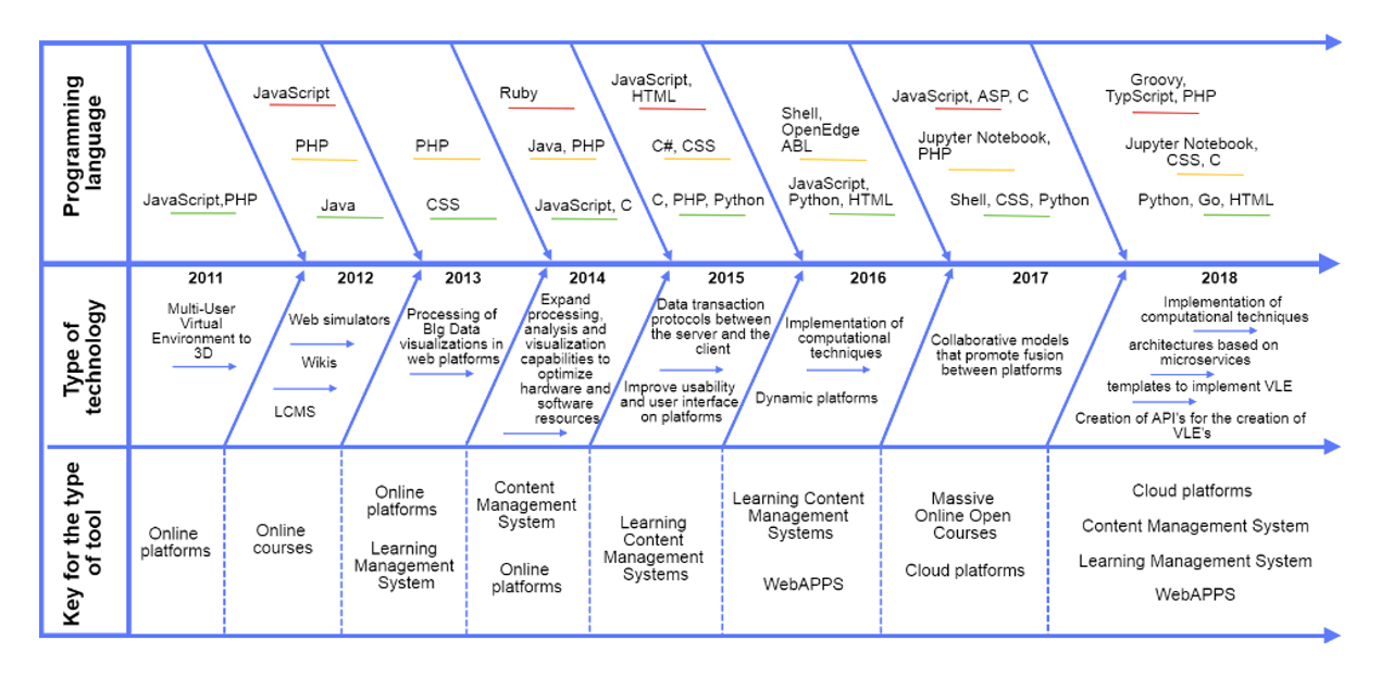 2015: The amount of data becomes a problem for VLEs. Therefore, it can be highlighted that, in this year, the processing of information is the main activity. Data transaction protocols are created between the server and the client. The languages used are C and Python, in a variety of projects [33], [34]. Also, this year, there is a remarkable growth to improve the usability and user interface on the platforms. The implementation of JavaScript, HTML, and CSS, is demonstrated in several projects [30], [35], [36].