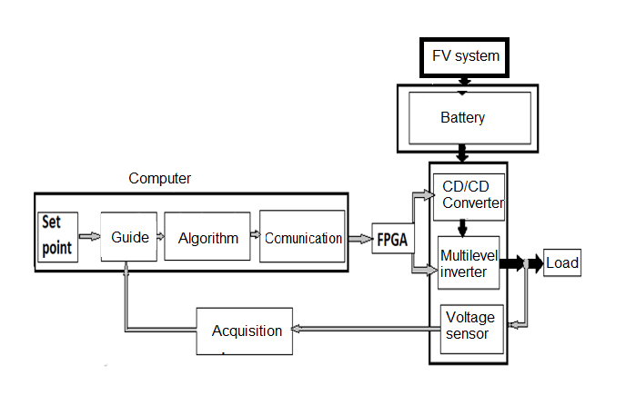 The implemented power converter corresponds to the topology shown in Fig. 1. Its power source is a DC bus, which can correspond to a set of batteries. The converter integrates a 48V nominal reduced component variable DC/DC regulator and a 2400 VA three-phase multilevel DC/AC power inverter, at 60Hz with 127V and 220V line phase voltages regulated by the drive angles and the bus. of DC. The general scheme of the developed prototype powered by an autonomous PV system is shown in Fig. 3.