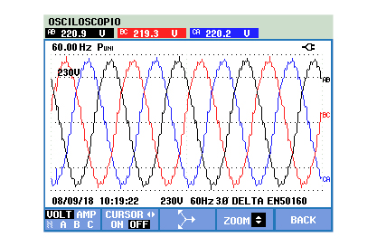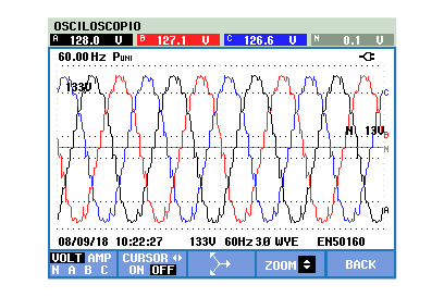 The waveforms measured by the analyzer for the phase and line voltages are shown in Fig. 11 and Fig. 12 respectively.