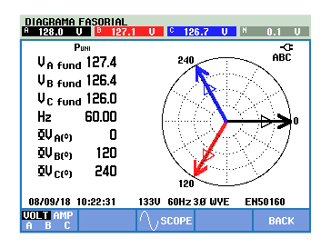 With respect to three phase behavior, Fig. 17 shows the phasor diagrams of the currents and voltages, in these it is observed that the transformation system is balanced, presenting only small variations of less than 1 volt, this is due to differences between the transformers. However, the behavior is satisfactory since the voltage unbalance corresponds to a value less than 1%, more specifically it is 0.47% according to the ANSI methodology, which corresponds to excellent behavior since an acceptable unbalance must be less than two%.