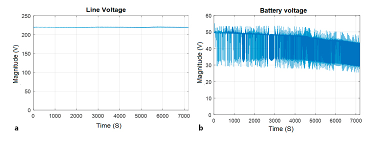 In Fig. 18b shows the profile of the input voltage of the converter, it is seen with strong variations due to the current demand of the load, and the current draw of the multilevel converter. It is also observed that the battery block voltage is initially higher than 50 volts and at the end of the test it is reduced to less than 43 volts, regardless of this behavior of the input voltage. At the output of the power converter, the voltage remains constant, which verifies that the prototype correctly mitigates the phenomena associated with long and short duration variations that could occur due to voltage variation, such as: swell, sag, undervoltage and overvoltage. Likewise, there are no flickers since the control of the output voltage prevents this phenomenon from occurring.