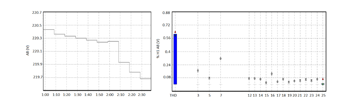 In the tests carried out, there are no frequency variations or voltage imbalances. These phenomena are mitigated by the developed prototype thanks to the implementation and regulation algorithms. The Fig. 21 shows the evaluation for these phenomena delivered by the network analyzer.