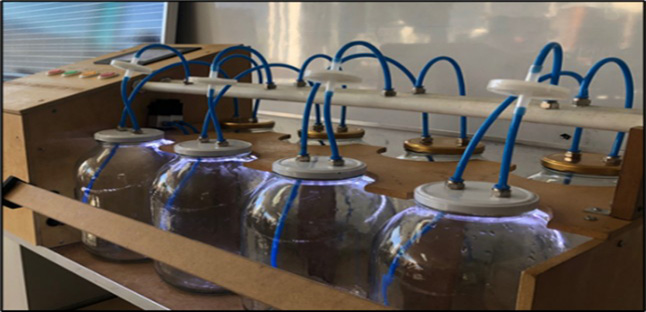 There are a total of eight glass containers to simulate the artificial environment where the micropropagation of each explant will take place. This container is called a bioreactor, which can be seen in fig. 4a-4b. Each one has a volume of 2600 cm3 and are located vertically.