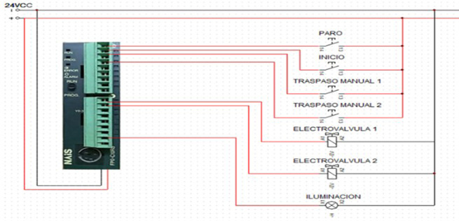 This device is responsible for governing each of the actions carried out by the plant: activation of solenoid valves, lighting control, activation of the compressor, communication with the HMI screen and reading of each digital signal found on the front panel: emergency stop, process start, manual transfer 1 and manual transfer 2.
