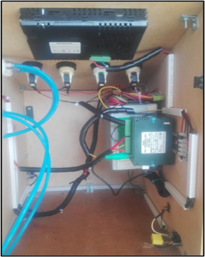 The electrical connection of the machine is made up of AWG 18 wiring; 24V DC is used to supply the power source to the PLC through an ATX source, from which 24V DC is derived for the digital signals that enter the PLC, such as emergency stop, start of process, manual transfer 1 and manual transfer 2. The machine uses low electrical power and due to this, the use of an ATX source is chosen. A gutter and shell are used for the correct distribution of the cabling. The fig. 12 shows the electrical diagram of the adopted controller, and fig. 13 the control panel from the inside that contains the electrical connections.