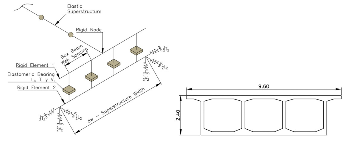 Fig 1. Spring abutment model for elastomeric bearings and cross-section of the bridge superstructure.