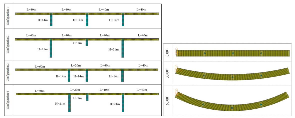 The concrete box girder bridge model selected in this study has a total length of 160 m with intermediate supports that vary in location and height. Additionally, plan curvature values of 0.00°, 30.00°, and 60.00° are defined for twelve bridge configurations. The boundary conditions associated with the elastomeric bearings are obtained from the design guidelines provided by CCP 14 and the Eurocode. Fig 2 shows the four main bridge configurations. It is essential to highlight that each bridge configuration presented in Fig 2 is associated with the three selected plan curvature values of 0.00°, 30.00°, and 60.00°, which are also depicted in Fig 2.