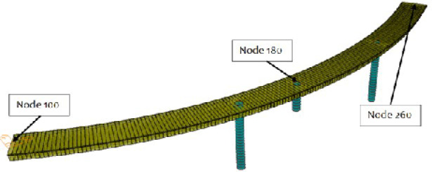 Fig 4 shows the location of the three displacement measurement points in the abutments (nodes 100 and 260) and the intermediate support (node 180). Fig 5 shows the displacements in the longitudinal “X” direction obtained at the previously mentioned measurement points for the straight bridge configuration 1 (no plan curvature).