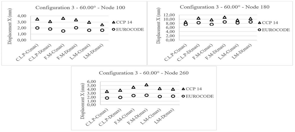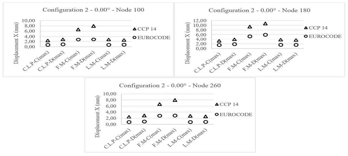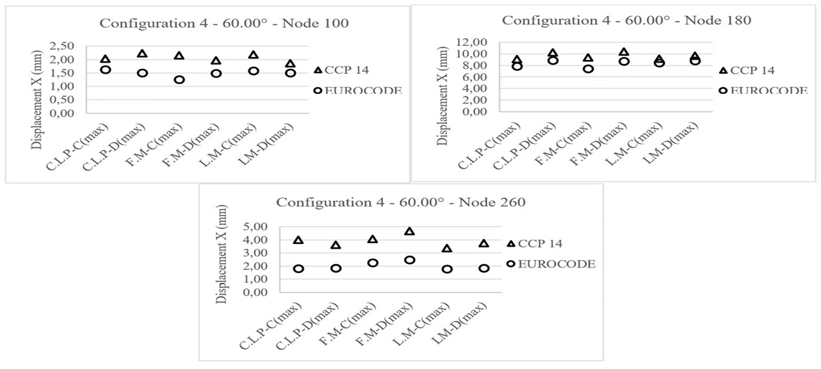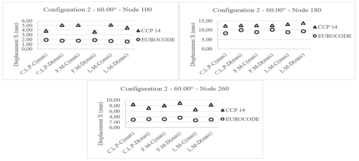 Fig 13 shows the displacements in the longitudinal “X” direction obtained for bridge configuration 1 (plan curvature of 60.00°). As previously discussed, larger displacements are observed for the elastomers designed by CCP 14 than for those designed by the Eurocode, showing variations between 26% and 71%. In addition, the frontal-field motion records acting in soil type “D” produce the largest displacements. It is also possible to identify that the largest displacements occur in the elastomeric supports located in the abutments, with variations ranging from 55% to 69%, in contrast with the elastomeric bearings located in the intermediate supports in which the variations vary from 26% to 31%. It is important to note that the elastomeric bearings located in the intermediate supports show the same type of seismic response, regardless of the motion record chosen; since the ranges of variation, displacements, and differences are very similar, this can be attributed to the curvature in plan and the fact that the soil effect is reduced in intermediate supports. Fig 14 shows the displacements in the “X” direction for bridge configuration 2 (plan curvature of 60.00°).