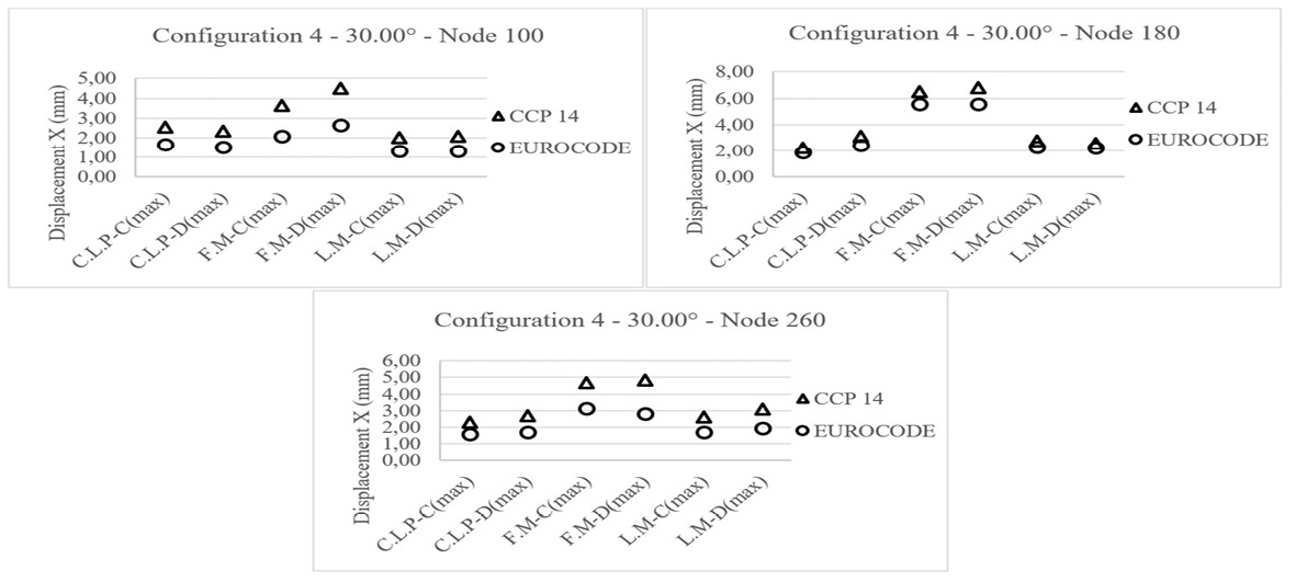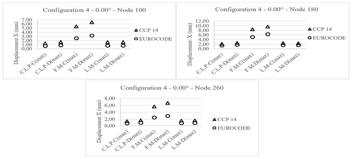 The elastomeric bearings designed by CCP 14 lead to larger displacements than those designed by the Eurocode, with variations ranging between 31% and 56%. Likewise, the frontal-field motion record continues to be the most critical. It is essential to highlight that in the intermediate support (node 180), no significant differences are observed in the seismic response obtained from the frontal-field record motion for the different types of soil types, partly because the elastomeric bearings located in the abutments are the ones that are most affected by the influence of the soil type. In contrast, the intermediate supports are located further away from the areas of the bridge in contact with the foundation soil. From the above, it is concluded that although the general trend is maintained for this bridge configuration, the ranges of variation and differences are smaller. However, the statements by [20] and [24] described above continue to be applicable. Fig 10 shows the displacements in the longitudinal “X” direction for bridge configuration 2 (plan curvature of 30.00°). For bridge configuration 3, the elastomeric abutment and intermediate support bearings show variations between 58% and 65% and 39% and 56%, respectively. Fig 11 shows the displacements in the “X” direction for bridge configuration 3 (plan curvature of 30.00°). It is possible to observe that the elastomeric bearings located in abutments and intermediate support show variations between 31% and 41% and 15% and 21%, respectively. Similar results regarding the larger displacements obtained from CCP 14 contrast those obtained from the Eurocode. Fig 12 shows the displacements in the “X” direction for bridge configuration 4 (plan curvature of 30.00°). As discussed in the foregoing, elastomeric bearings designed by CCP 14 lead to more significant seismic displacements than those designed by the Eurocode.